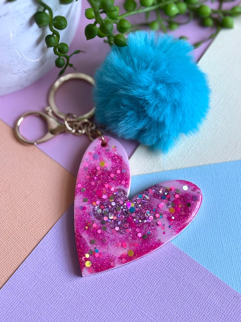 Hand mixed resin with custom mixed glitter resulting such amazing fun colour combination for this love heart keyring finished the look with cute puffy tassel.