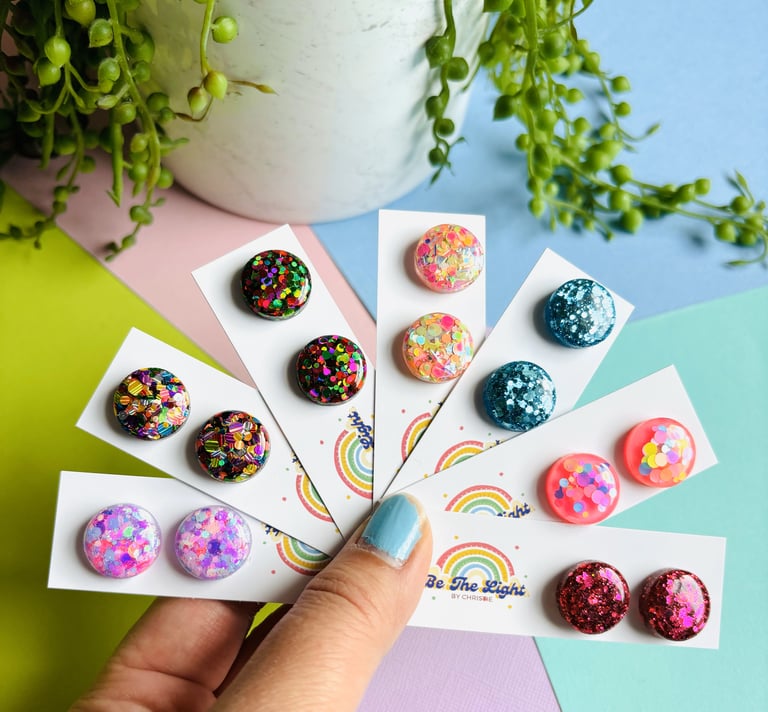 Hand mixed and resin poured into fun mini stud collection, the glitter confetti colours on these are just STUNNING.