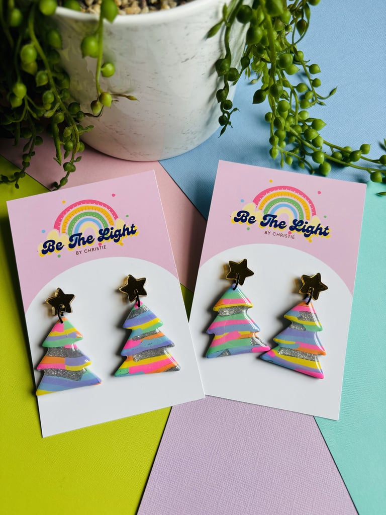 Hand mixed Polymer clay into lovely Rainbow Christmas tree with cute rainbows stripes and coated with resin for a glossy look then finished with gold mirror acrylic star topper.