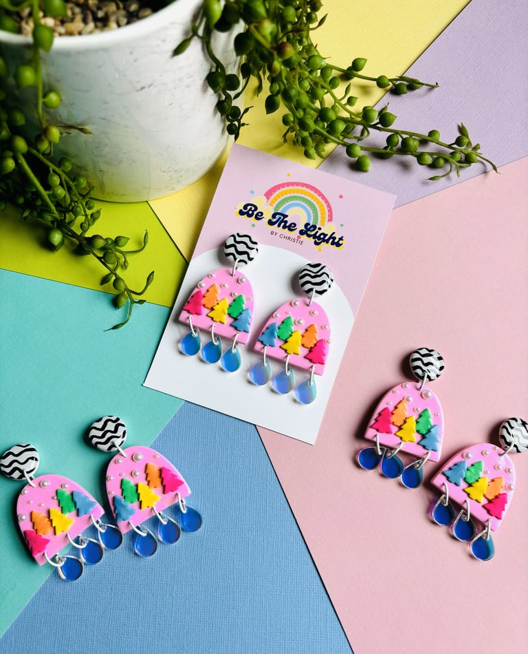 Hand mixed Polymer clay into lovely rainbow trees and rainbow with a cute squiggly topper and iridescent teardrops.